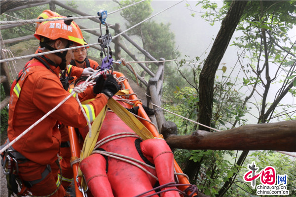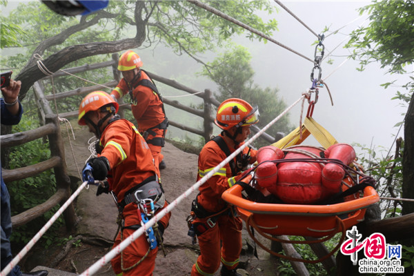 26日,在武陵源景区,武陵源消防中队和天子山消防中队的消防员们进行了横渡救援和索降搜救的实景演练,张家界消防支队战训科科长赵彪指出,针对不同的救援场所,消防员要搭建不同的绳索救助系统,有利于同时保护被困者和施救人员的安全。除了绳索技术,山地负重行进、滑绳下降、横渡救人、索道救援操等也都是针对山岳救援开展的消防员科目训练。