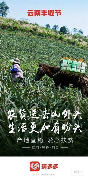 4月7日,拼多多“云南丰收节”走进红河州河口县以及屏边县、红河县两个国家级贫困县,带动当地菠萝、小土豆、水果玉米等农产品大规模上行,并借此契机,向4亿消费者推广普及大理独头蒜、老班章普洱茶、文山三七粉等带有地区品牌属性的特色农产品。
