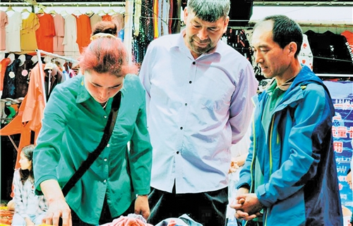 在巴扎上,陈耀平(右一)和吐尔逊·托乎提夫妻二人为孩子买衣服。 经济日报-中国经济网记者 马呈忠摄