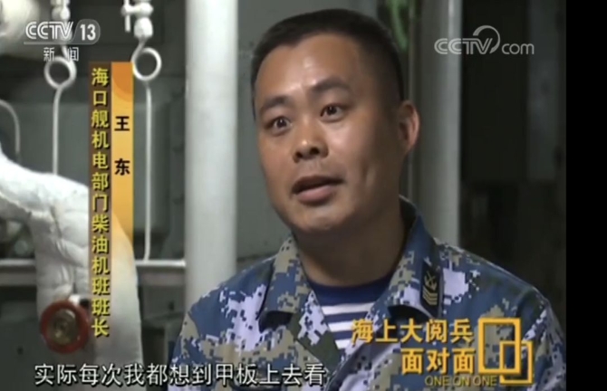 在驱逐舰群中,舷号为171的海口号驱逐舰排在第五位。海口号驱逐舰是中国海军第一代具备相控阵雷达、垂直发射系统的防空型导弹驱逐舰。入列十几年,海口舰3次赴亚丁湾护航,多次参加多国联演,航迹不断向远海延伸。在准备和接受检阅的几个小时内,海口舰机电部门柴油机班长王东,一直坚守在发动机机舱内。