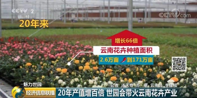 1999年,云南昆明成功举办了世园会。一位花卉经销商表示,他的生意也发生了翻天覆地的变化。20年前,他的年营业额大约是一、二十万元,而在去年,他的花卉公司达到6000万元的营业额。