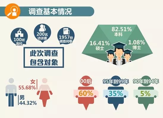 此次调查,覆盖包括北京大学、清华大学、浙江大学、西安交通大学、华南理工大学、海南师范大学等在内的全国20多个省区市100所高校的1957名大学生,其中“00后”成为调查主体,占比60%,“95后”占35%,“90年到94年”占5%。