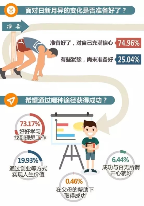 数据显示,80%的受访者认为“自己具备某一方面的才能和优势”,74.96%的受访者表示“面对日新月异的世界,已经准备好了”。