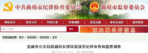 昆明信息港讯 4月30日,从曲靖市纪委市监委网站获悉,据宣威市纪委监委消息:宣威市公安局原副局长缪祥显涉嫌严重违纪违法,目前正接受纪律审查和监察调查。