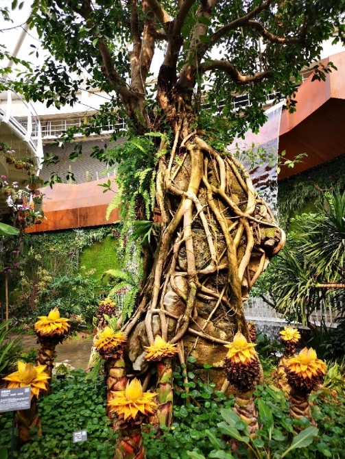 其中,高19米的青果榕树最为高大,被亲切地称为“大板根爷爷”,是植物馆的“镇馆之宝”。它来自云南西双版纳,展示出了热带植物如何长高的秘密。由于热带土壤疏松,根茎向侧方生长,像板子一样支撑在植物四周,展示出顽强的生命力。