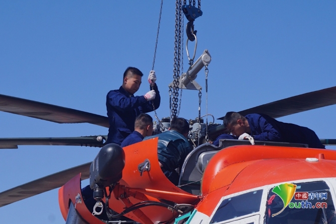 飞行过后,机械师进行直升机维护。 中国青年网记者 曹迪摄
