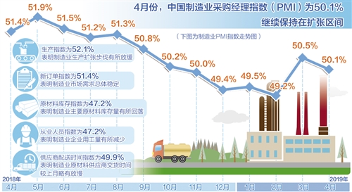 4月份,制造业PMI为50.1%,虽然比上月回落0.4个百分点,但连续两个月处于临界点之上,且为2018年11月以来的次高点。