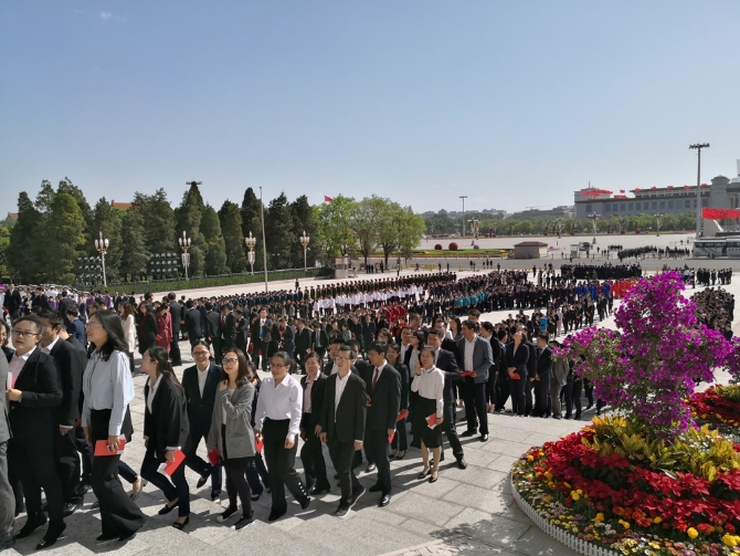 △现场的四个彩色方阵是来自清华大学(紫色),北京大学(白色),中国人民大学(红色),北京师范大学(蓝色)的大学生代表。(央视记者周志国拍摄)