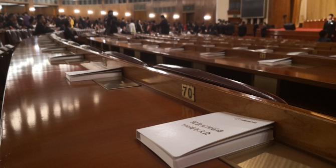 △每一位参会者面前都摆放着一本封面印有“纪念五四运动100周年大会”的笔记本。(央视记者钟锋拍摄)