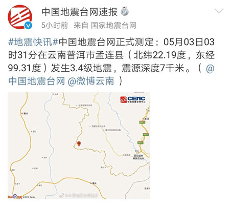 昆明信息港讯 据中国地震台网速报5月3日消息,中国地震台网正式测定:5月3日3时31分在云南普洱市孟连县(北纬22.19度,东经99.31度)发生3.4级地震,震源深度7千米。