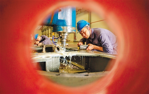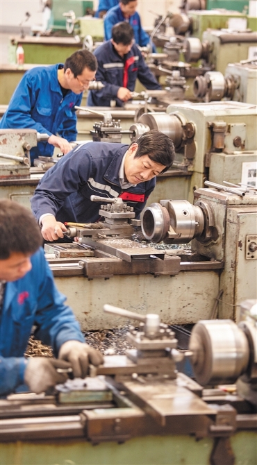 5月2日,位于山东省日照经济技术开发区的山东双港活塞有限公司工艺装备车间,全国五一劳动奖章获得者李为刚(中)带领“青年突击队”开展技术攻关。作为一线工人的李为刚曾先后获得国家实用新型专利7项,国家发明专利2项。 田 磊摄(中经视觉)