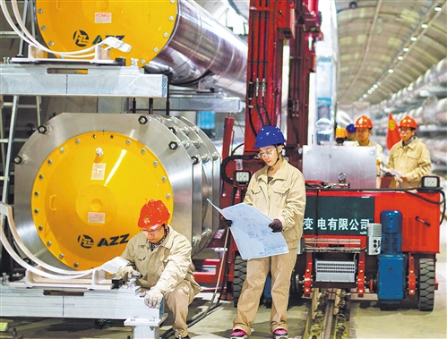 5月1日,江苏省常熟市,全球首条特高压输变电工程苏通GIL综合管廊电气施工现场,“90后”博士生陈春超(左一)与“90后”硕士生原睿萌(左二)在组装管廊电气设备。该工程项目全长5468.5米,被称为“万里长江第一廊”。汤德宏摄(中经视觉)