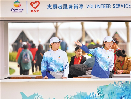 5月1日,北京世园会,来自北京邮电大学世纪学院的大学生志愿者徐小雯(右一)在为游客热情服务。本报记者 高兴贵摄