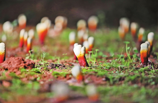 锦屏镇景范村白羊田的灵芝种植大棚内,一株株肥嘟嘟、肉乎乎的灵芝嫩芽破土而出,根部朱红,中部渐变为姜黄色,上部则呈乳白色,远远望去,像调皮幼儿用彩笔涂抹过的娇憨小脚丫、胖手指。