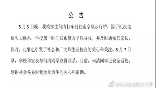 今天早上,@南京航空航天大学发布公告,何清同学已安全返校,感谢社会各界对该生的关心和帮助。