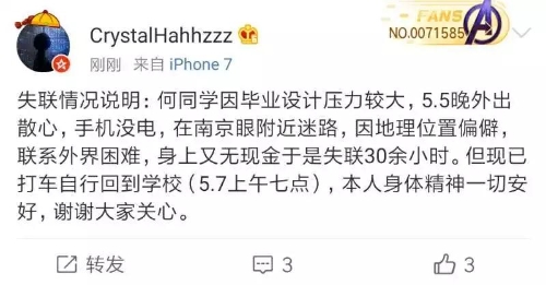 网友@CrystalHahhzzz称,何同学因毕业设计压力较大,5.5晚万外出散心,手机没电而且迷路,联系外界困难,身上无现金所以失联30余小时,现已经回校。(现代快报 新浪微博)
