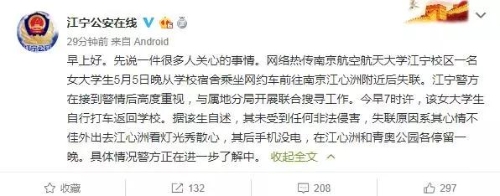 5月5日晚九点后,南京航空航天大学一名大四女生与学校和父母失去联系,其家人报警。