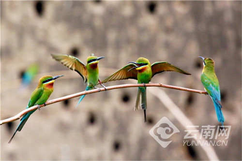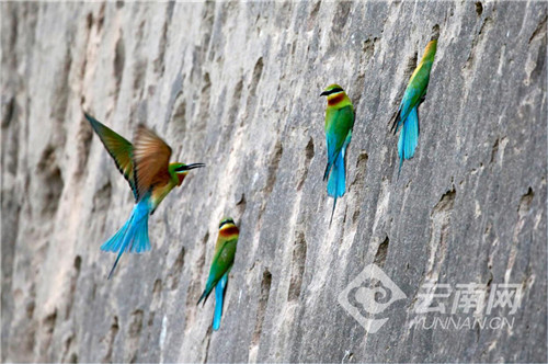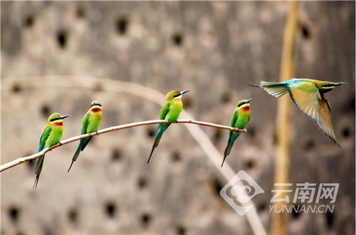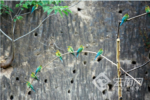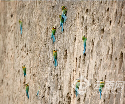 每年从4月初开始,数以万计的栗喉蜂虎陆续到达巧家县的江边河谷地带度夏筑巢繁衍后代,将鸟巢筑在沿江沙岩壁上。它们5月中下旬到7月初繁殖幼鸟,8月初带着儿女逐渐离开。