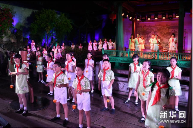 5月5日,小学生在福州三坊七巷的水榭戏台表演。 新华社记者林善传/摄