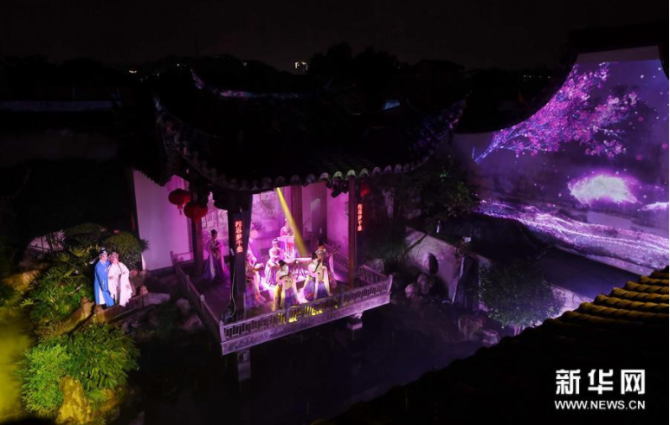 5月5日,演员在福州三坊七巷的水榭戏台表演传统文化演出。新华社记者林善传/摄