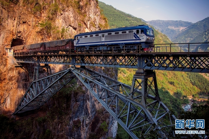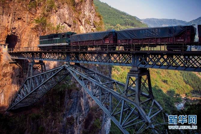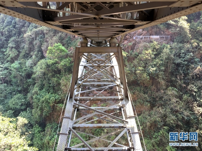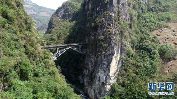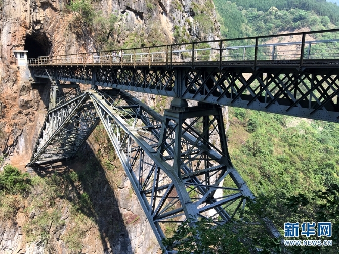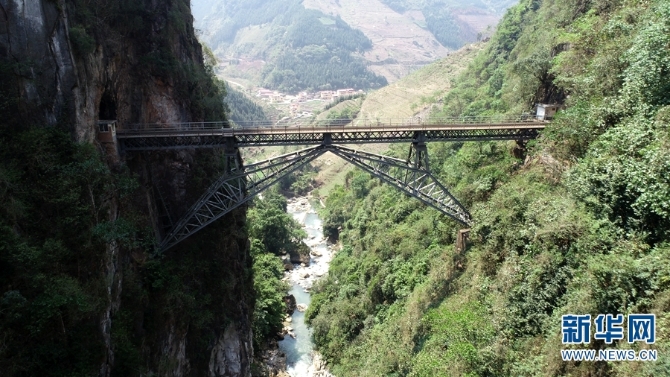 在云南省红河州屏边县,有一座横跨于悬崖峭壁间的铁路桥——五家寨铁路桥,因形似“人”字,也被称作“人字桥”。五家寨铁路桥距谷底约100米,由钢板、槽、角钢、铆钉联结而成,是滇越铁路的标志性工程,也是研究滇越铁路及中国桥梁史的重要实物资料,2006年被列入“全国重点文物保护单位”。
