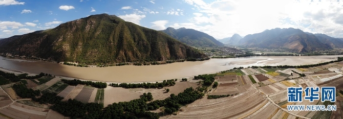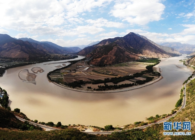 “长江第一湾”位于云南省丽江市石鼓镇与香格里拉县沙松碧村之间。长江从青藏高原奔腾而下,从四川甘孜州巴塘县进入云南,与澜沧江、怒江一起在横断山脉的高山深谷中穿行形成了“三江并流”的壮丽景观。到了石鼓镇和沙松碧村之间,突然来了个100多度的“急转弯”,形成罕见的“V”字形大弯,人们称这天下奇观为“长江第一湾”。新华网发(王俞/摄)