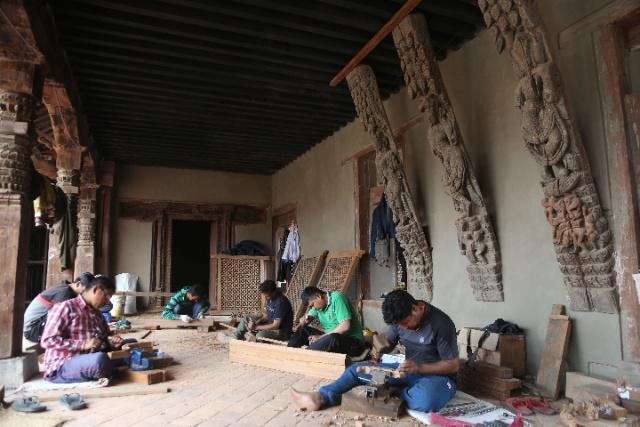 图为尼泊尔工匠在雕刻神庙部件。(新华社发,苏尼尔·夏尔马摄)