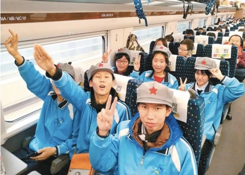 学生乘着研学专列向革命圣地出发。