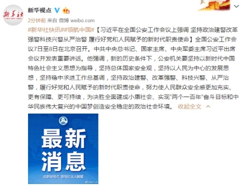 【习近平在全国公安工作会议上强调 坚持政治建警改革强警科技兴警从严治警 履行好党和人民赋予的新时代职责使命】全国公安工作会议7日至8日在北京召开。中共中央总书记、国家主席、中央军委主席习近平出席会议并发表重要讲话。他强调,新的历史条件下,公安机关要坚持以习近平新时代中国特色社会主义思想为指导,坚持总体国家安全观,坚持以人民为中心的发展思想,坚持稳中求进工作总基调,坚持政治建警、改革强警、科技兴警、从严治警,履行好党和人民赋予的新时代职责使命,努力使人民群众安全感更加充实、更有保障、更可持续,为决胜全面建成小康社会、实现“两个一百年”奋斗目标和中华民族伟大复兴的中国梦创造安全稳定的政治社会环境。