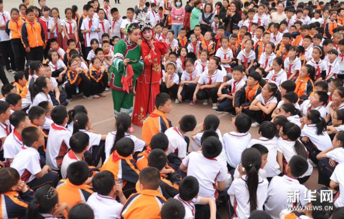 5月8日,沧州市小凤霞评剧团演员在肃宁县第三实验小学演出评剧选段。 新华社记者朱旭东/摄