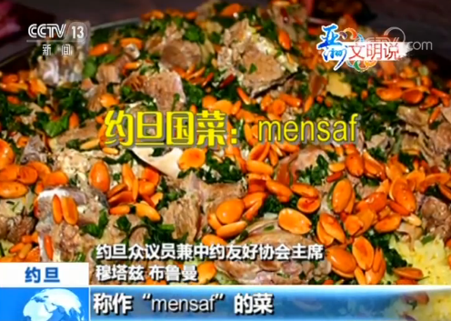 约旦众议员兼中约友好协会主席 穆塔兹·布鲁曼(Mutaz Bluman):我最想让中国人尝尝的是我们约旦一道特殊的称作“mensaf”的菜。“mensaf”是约旦的一个象征,由肉和米饭做成,我们知道中国人喜欢吃米饭、白米饭,另外还有酸奶、奶,所有这些在一起烹饪而成的菜就称作“mensaf”,约旦家家户户都吃这道菜,这也就是为什么当来自不同文化国家的人来约旦拜访我时,我请他们到外面吃饭时,他们都会想尝尝“mensaf”。