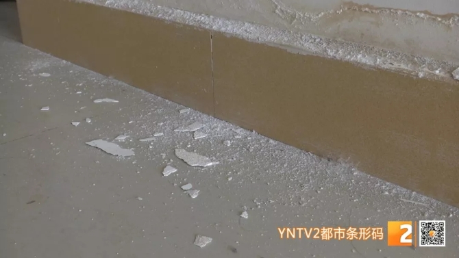 物业工作人员:“验的时候发现漏水了,我们已经上报给公租房公司了,还有就是地板条脱落,脱落原因是墙体水管漏水,地板被水泡了就会翘,还有卫生间顶也是这样。”