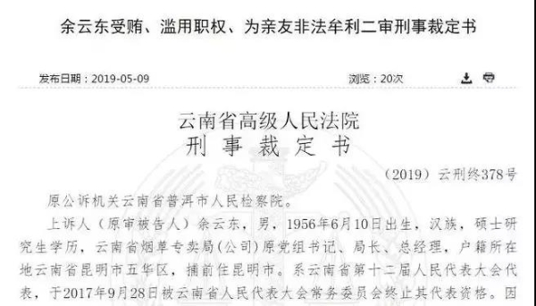 昆明信息港综合 近日,中国裁判文书网公布了云南省烟草专卖局原局余云东的二审判决书。判决书显示,一审法院判处余云东有期徒刑13年,并处罚金人民币230万元。余云东不服判决,提出上诉。云南省高级人民法院二审驳回上诉,维持原判。