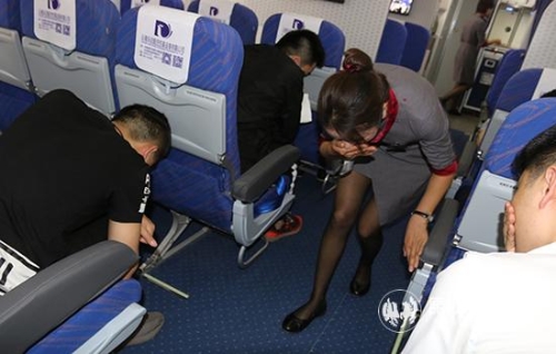乘务员安抚旅客并引导旅客俯身低头捂住口鼻