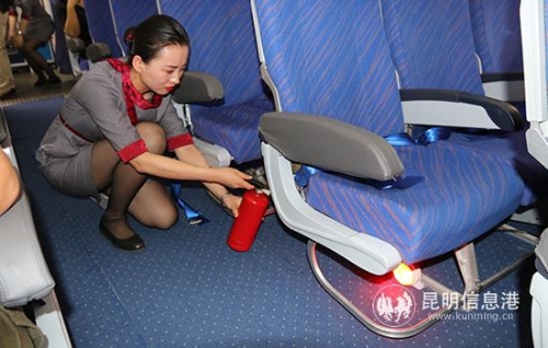 模拟座椅背后锂电池失火,乘务员进行灭火处置