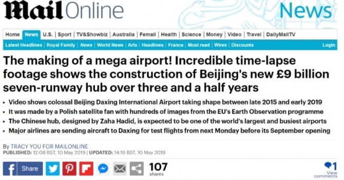 《每日邮报》报道称,北京大兴国际机场航站楼由已故英籍伊拉克建筑师扎哈•哈迪德(Zaha Hadid)设计,目前正处于建设的最后阶段。今年9月正式投入运营后,大兴机场将成为世界上最繁忙和最大的交通枢纽之一。
