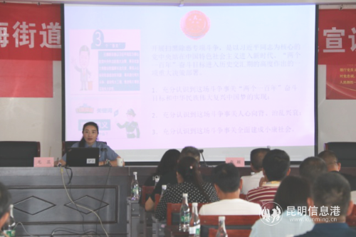 昆明信息港讯 通讯员龙蕊 为认真贯彻云南省扫黑办关于开展扫黑除恶专项斗争主题宣讲教育活动的通知精神,严格落实西山区委宣传部关于组织开展扫黑除恶专项斗争主题宣讲教育活动的要求和工作部署, 近日,西山区人民检察院未检办负责人、“春蕊工作室”负责人龙蕊作为西山区扫黑除恶宣讲团成员应邀在福海街道办事处,为街道副科以上领导、机关支部全体党员、社区书记、主任、副书记、党员代表等100余人进行了“开展扫黑除恶 建设善美云南”的扫黑除恶专项斗争主题宣讲。