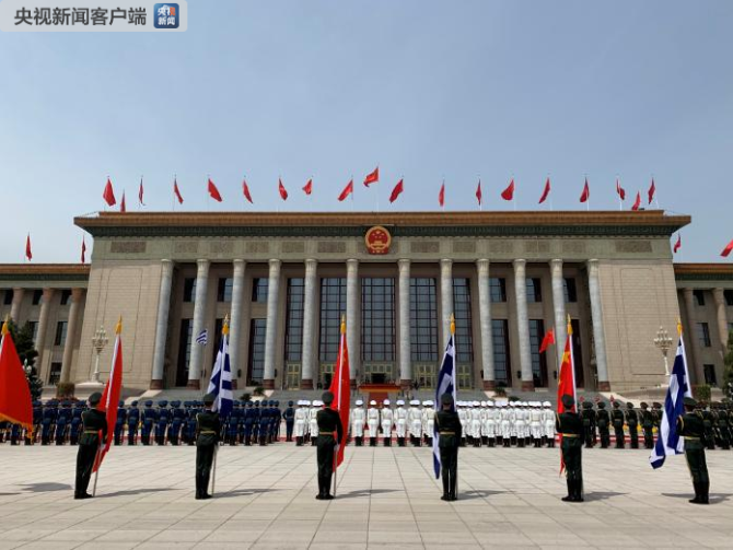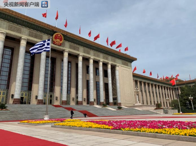 希腊国旗在人民大会堂东门外广场升起,欢迎希腊总统的仪式即将开始。(央视记者段德文拍摄)