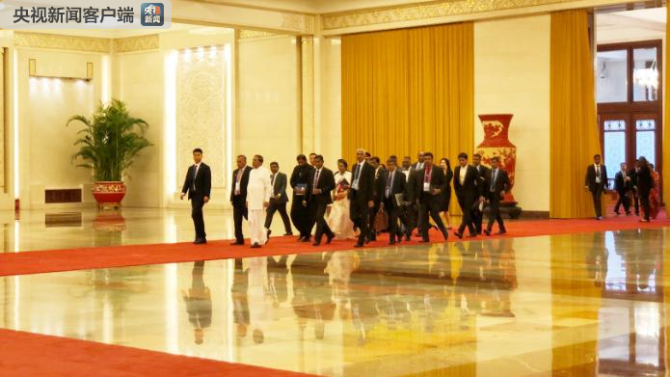斯里兰卡总统西里塞纳率团抵达人民大会堂与习近平会面。(央视记者许永松拍摄)