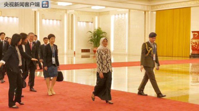 前来与习近平会面的新加坡总统哈莉玛。(央视记者许永松拍摄)