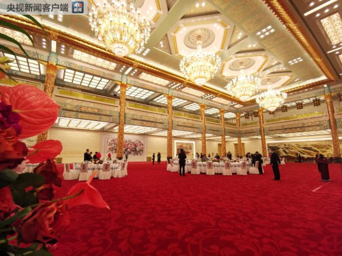 金色大厅位于人民大会堂三层,面积约2200平方米。大厅有20根朱红漆金巨柱,5盏金光闪闪的巨型吊灯从顶部垂下。(央视记者张宇拍摄)