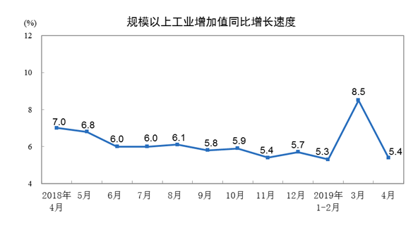 记者从国家统计局获悉,2019年4月份,规模以上工业增加值同比实际增长5.4 %(以下增加值增速均为扣除价格因素的实际增长率),比3月份回落3.1个百分点。从环比看,4月份,规模以上工业增加值比上月增长0.37%。1-4月份,规模以上工业增加值同比增长6.2%。
