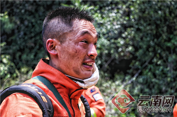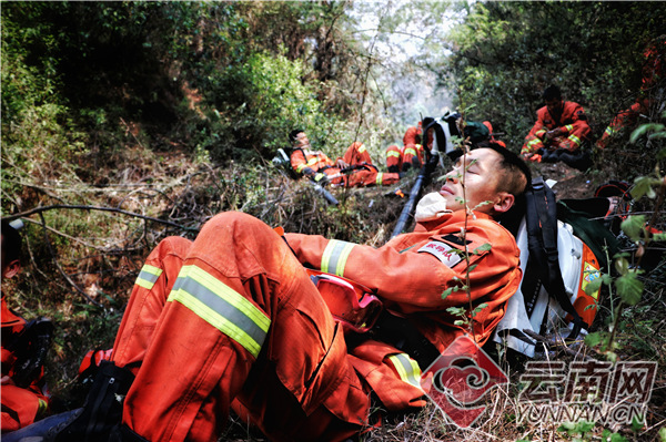 消防员刚从火线撤下来。陈坤 茹龙俊 摄