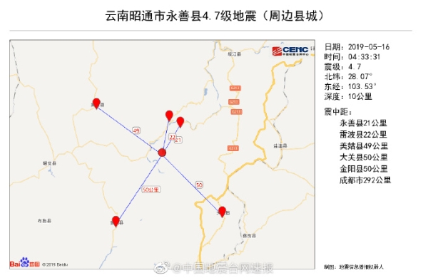 记者从昭通市永善县政府新闻办获悉,中国地震台网正式测定:5月16日04时33分在永善县(北纬28.07度,东经103.53度)发生4.7级地震,震源深度10千米,震中位于黄华镇与务基镇交界的黄华镇米贴村岩脚社。本次地震周边20公里内的乡镇有务基乡、黄华镇、马楠乡、九龙镇、水竹乡、溪洛渡镇、佛滩乡。震中距永善县21公里,距四川雷波县22公里,距昭通市84公里,距成都市292公里,距昆明市362公里。