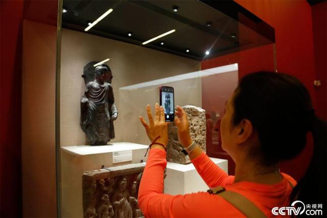5月15日上午,记者通过网络预约实地观展,发现展览共设计成四个部分。此外,为配合大会召开,中国国家博物馆还同期展出“殊方共享——丝绸之路国家博物馆文物精品展”。一名观展群众在展馆内用手机拍摄。