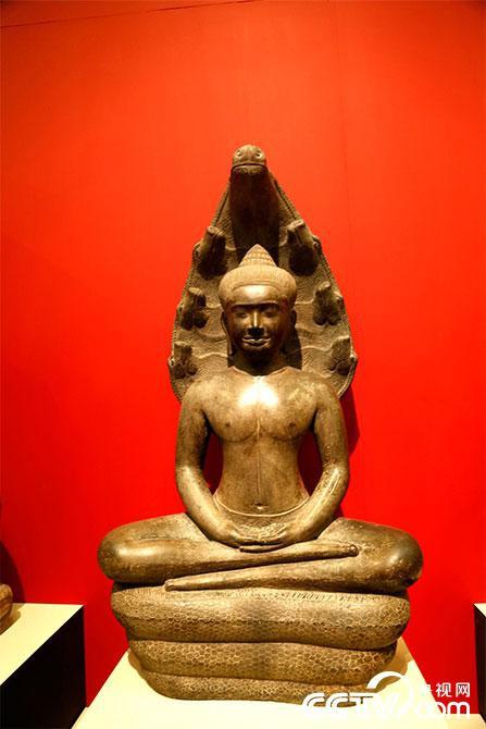 来自柬埔寨国家博物馆的公元七世纪(前吴哥时期)石雕蛇王纳迦护佛像。
