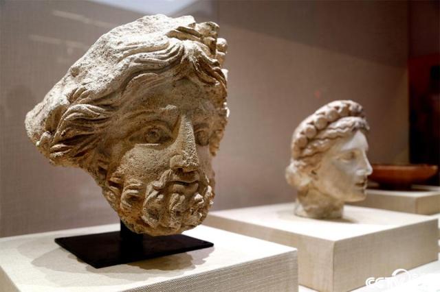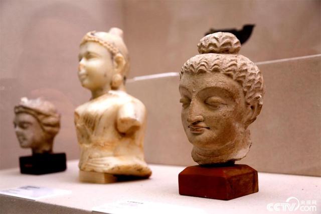 巴基斯坦考古与博物馆司提供的灰泥佛陀头像和大理石女供养人像。