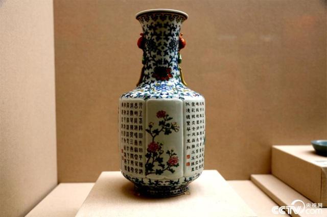 故宫博物院馆藏的清代斗彩勾莲纹开光粉彩诗句花卉纹瓶。