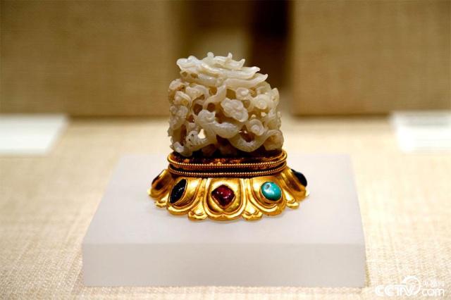 湖北省博物馆馆藏的金镶宝白玉镂空云龙帽顶。2001年在湖北钟祥市梁庄王墓出土。