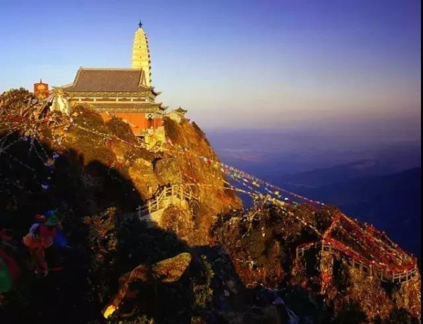 乘索道上金顶寺,在云雾之中,悬崖之上,颤颤巍巍到了中转站,步行过一片杜鹃林,便到了金顶寺,路边有卖姜茶的山民,冷天热热喝上一碗,可驱除山顶寒气,也有饭店旅舍,卖小吃香烛,爬到此处,饥肠辘辘,吃一点大理乳扇,土豆凉粉,聊以慰藉。